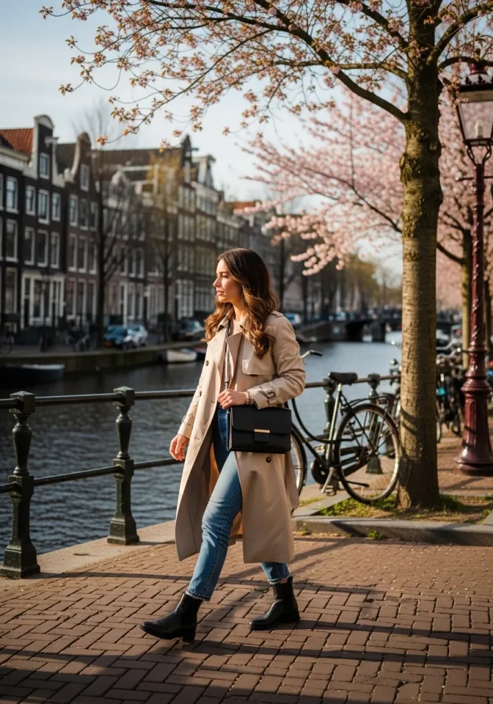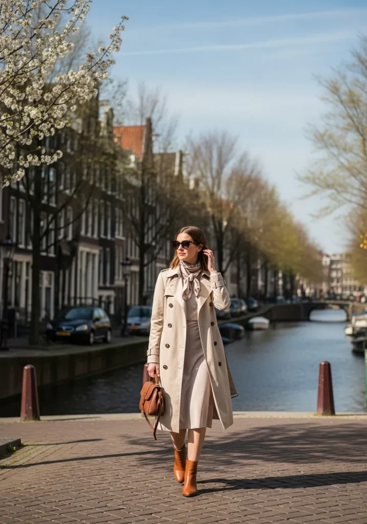 Pairing a trench coat with a simple dress creates a polished Amsterdam outfit that feels timeless and elegant. This look works especially well for travelers wondering what to wear in Amsterdam in spring, as it offers both warmth and breathability. The trench adds structure while the dress keeps the outfit light and feminine. It’s perfect for sightseeing, café hopping, or casual dinners.