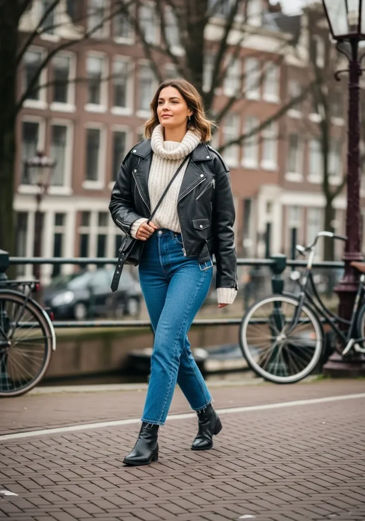 A cropped leather jacket layered over a chunky knit sweater creates a bold yet cozy Amsterdam outfit with modern city style. This look captures that slightly edgy European fashion vibe while staying practical for long days of exploring. It’s an excellent option for outfits for Amsterdam in March, when mornings are cool but afternoons feel mild. The layered textures also add depth, making it perfect for outfit ideas Amsterdam travelers love.