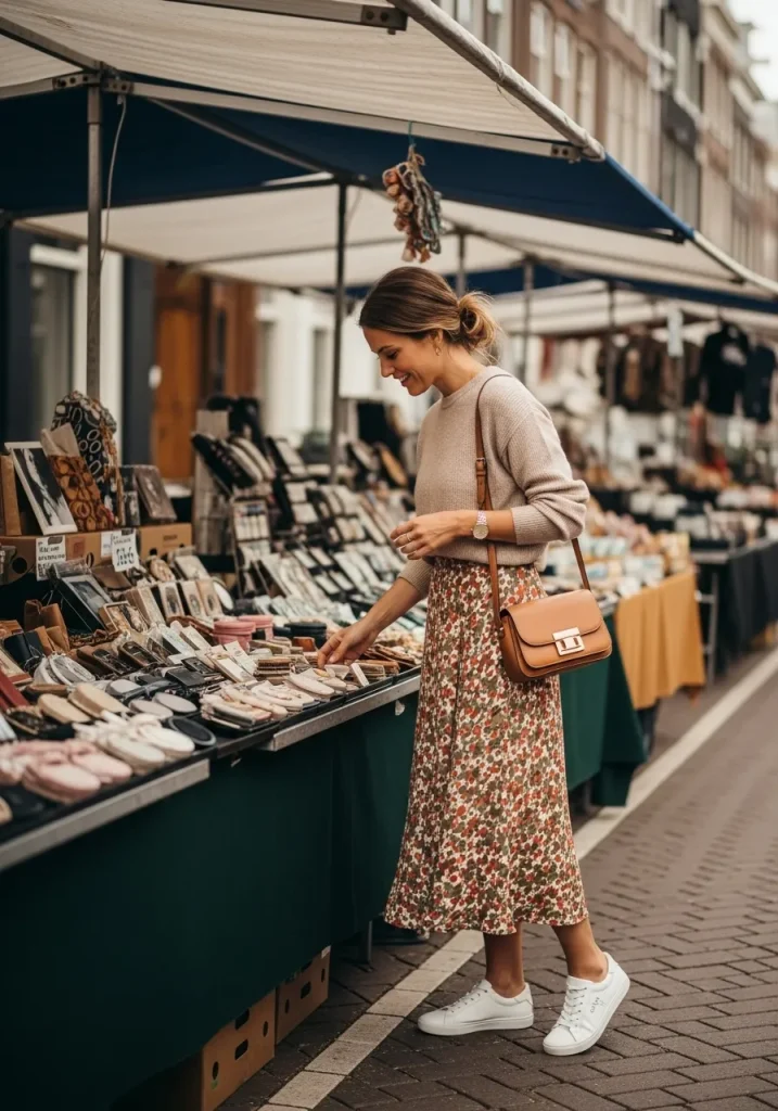 Exploring local markets calls for an easy, stylish markets outfit that feels relaxed yet put together. A flowy midi skirt paired with a fitted knit top creates a feminine silhouette that fits right into the Amsterdam city vibe. This look is perfect for browsing flower stalls, vintage shops, or food markets without feeling overdressed. It’s a popular choice among travelers looking for aesthetic clothes that photograph beautifully.