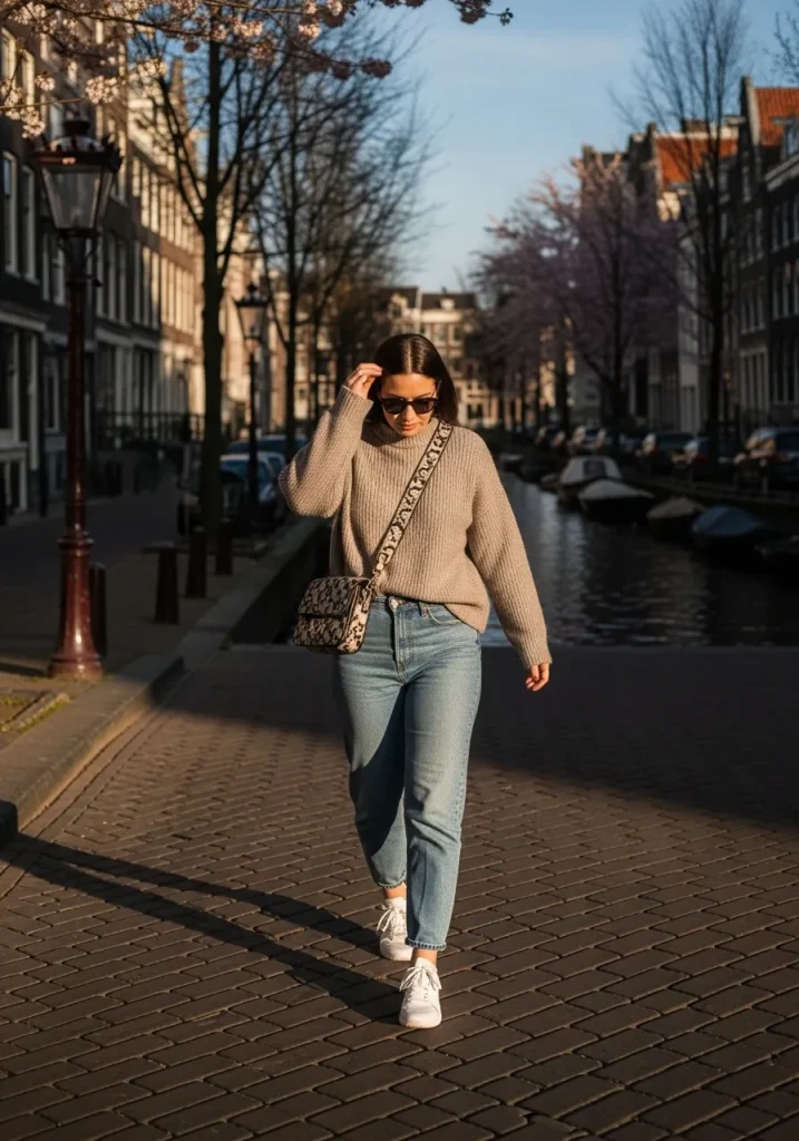 Layering lightweight knits with tailored pants or jeans keeps the outfit flexible. Finish with sneakers or loafers for all-day comfort. This look is especially suitable for what to wear Amsterdam spring, offering warmth without heaviness. It’s a practical yet chic Amsterdam outfit idea that fits effortlessly into a minimalist travel wardrobe.