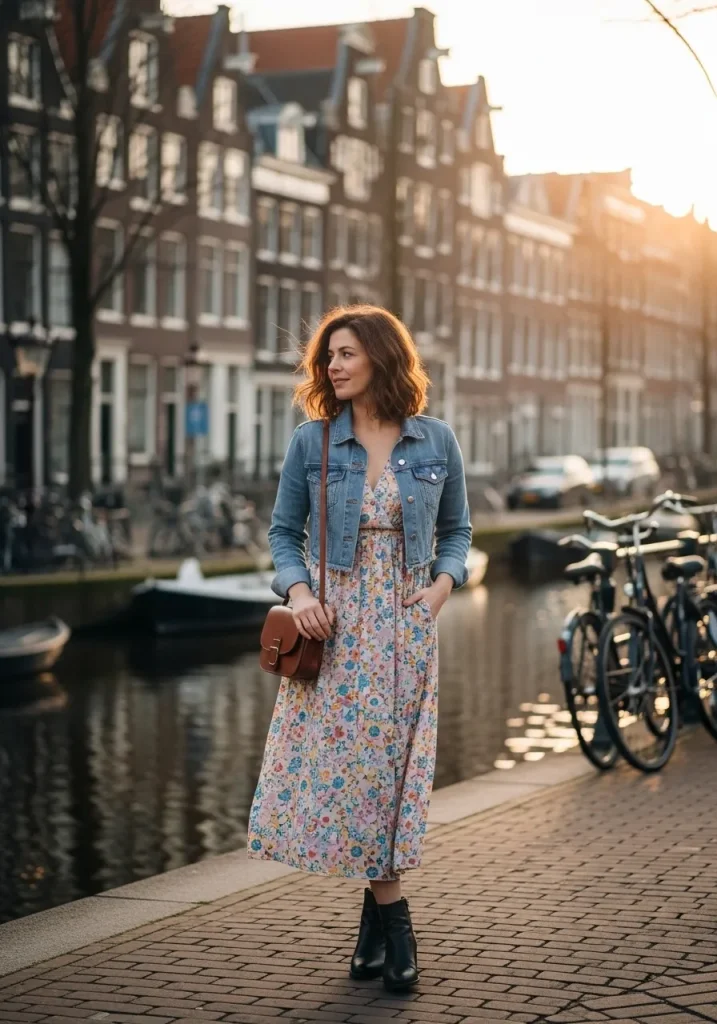 A flowy spring dress layered with a cropped jacket is a go-to choice for travelers wondering what to wear in Amsterdam in spring. This outfit feels feminine yet practical, making it perfect for sightseeing and snapping photos along the canals. It’s especially suited for outfits for Amsterdam in April, when the weather starts to feel milder but still unpredictable. The look blends aesthetic clothes with everyday comfort.