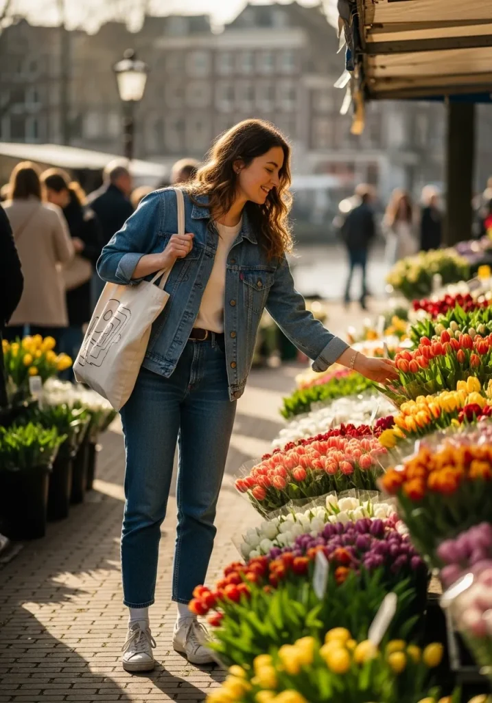 A denim jacket layered over casual basics is ideal for a relaxed markets outfit while exploring Amsterdam’s local scenes. This look is comfortable, practical, and fits perfectly into the city’s casual travel style. It’s great for browsing flower markets, vintage shops, or food stalls without feeling overdressed. The outfit captures the essence of casual looks Amsterdam outfit inspiration.