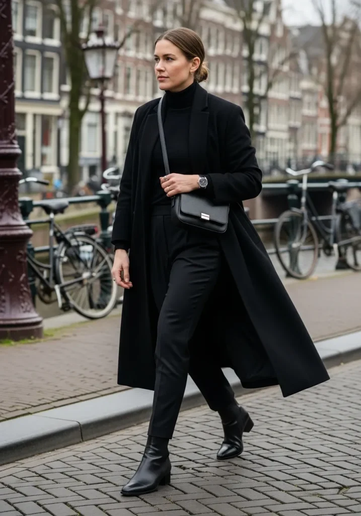 Break up the monochrome look with textured fabrics or subtle trendy accessories like a leather bag or statement sunglasses. This outfit fits effortlessly into outfits for Amsterdam, especially if you’re planning cooler spring days or even early fall travel. It’s a timeless Amsterdam outfit idea that works year-round.