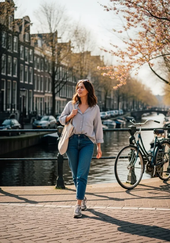 A relaxed button-down shirt paired with straight-leg jeans is one of the most wearable outfits to wear in Amsterdam. This look is simple, breathable, and perfect for full days of sightseeing. It captures the effortless city style locals love while keeping your outfit comfortable and functional. It’s an excellent choice for travelers planning spring outfits Amsterdam style.