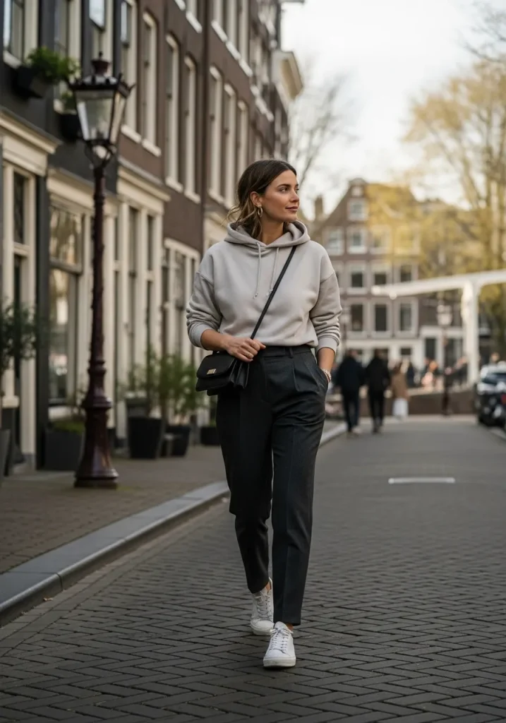 A casual hoodie paired with tailored pants creates a stylish yet comfortable travel outfit perfect for full days of exploring. This look blends relaxed comfort with modern city style, making it ideal for travelers who want practical outfits for Amsterdam without looking too sporty. It’s especially useful for travel days or long sightseeing routes. The mix of casual and tailored pieces keeps the outfit visually balanced.
