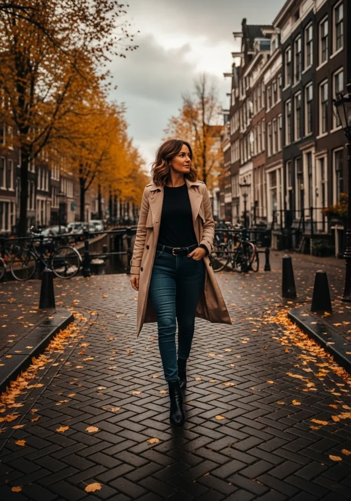 October weather calls for smart layering, and a trench coat over simple basics is a classic solution. This look works perfectly for what to wear in Amsterdam in October, offering warmth and flexibility throughout the day. It’s polished, practical, and fits naturally into the city’s effortless city style. The layered approach also makes it ideal for changing weather conditions.