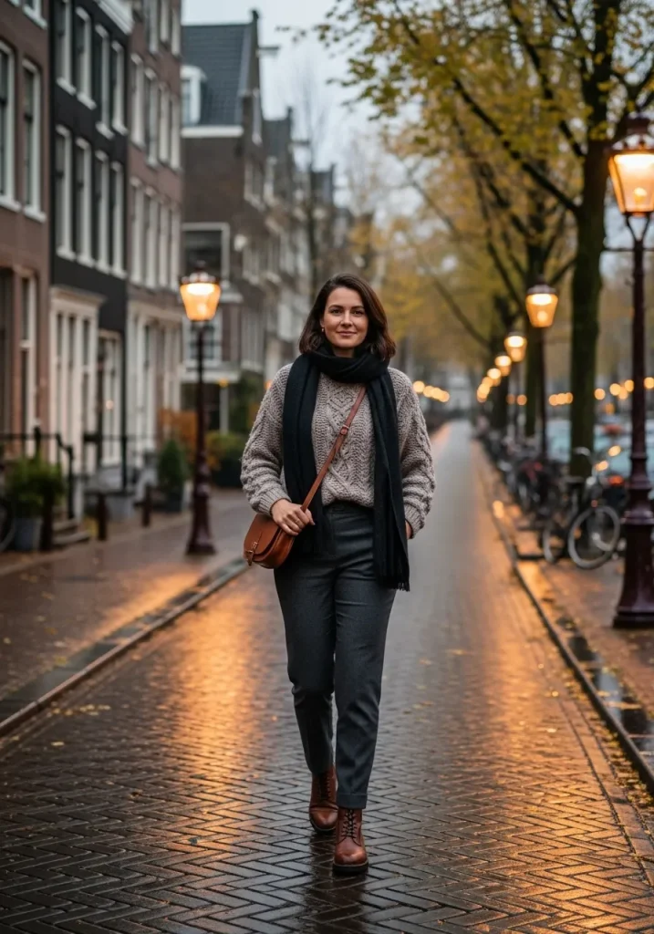 Colder days in November call for cozy textures and warm layers. A chunky knit sweater paired with boots creates a comfortable yet stylish look for what to wear in Amsterdam in November. This outfit feels relaxed but still polished enough for city exploring. It’s perfect for travelers who prioritize warmth without compromising style.