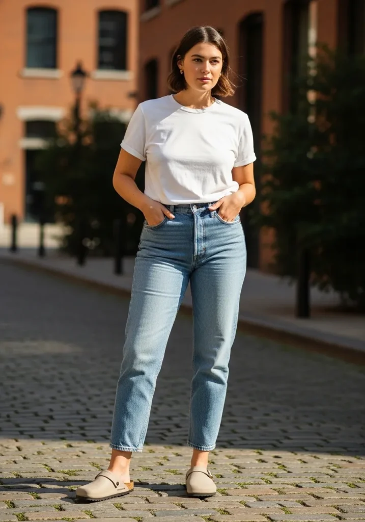 Birkenstock Clogs with Straight-Leg Jeans and Tee