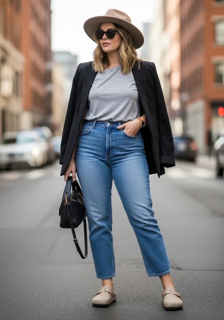 A blazer paired with jeans and Birkenstock clogs creates a perfect balance between polished and relaxed style. The structured blazer instantly elevates the outfit, while the clogs keep it grounded and comfortable. This combination is ideal when you want to look put together without feeling overdressed.