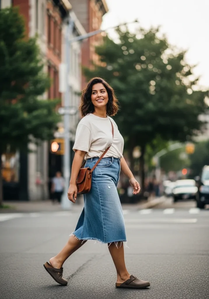 Birkenstock Clogs with Denim Skirt and Tee