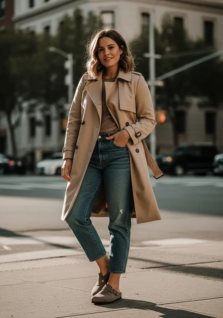 Birkenstock Clogs with Trench Coat and Jeans