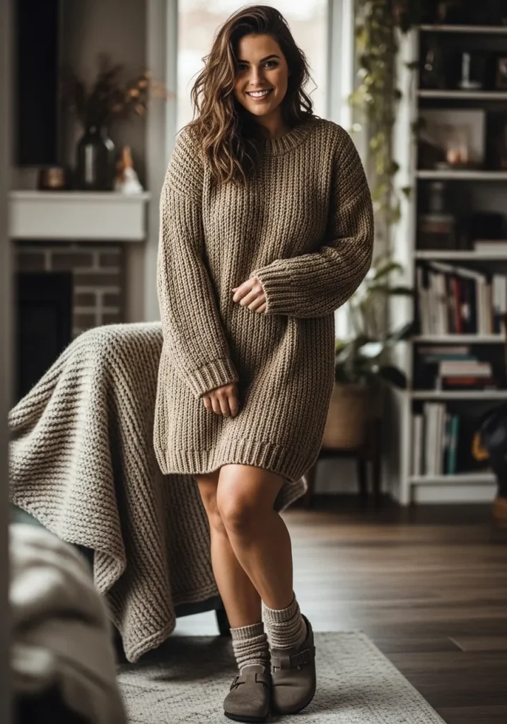 A sweater dress paired with Birkenstock clogs creates a cozy and stylish outfit that feels perfect for cooler weather. The soft knit fabric adds warmth, while the clogs keep the outfit casual and comfortable.