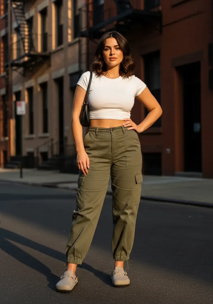 Cargo pants paired with a crop top and Birkenstock clogs create a trendy and slightly edgy outfit. The relaxed fit of the cargo pants contrasts with the fitted top, creating a balanced silhouette.