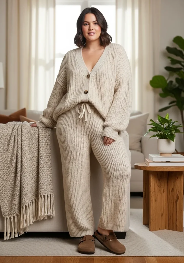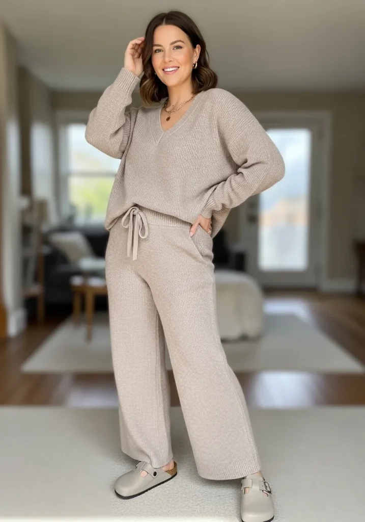 A knit set paired with Birkenstock clogs creates a cozy and elevated outfit that feels perfect for relaxed days. The soft knit fabric adds warmth while the clogs keep the look casual.