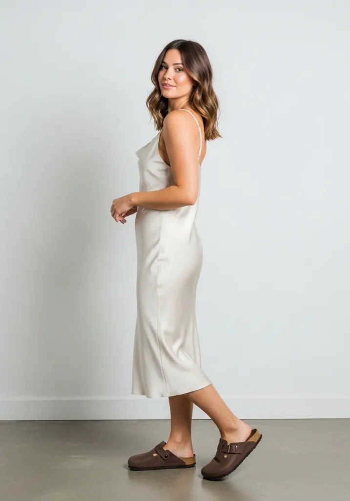 A slip dress paired with Birkenstock clogs creates a beautiful contrast between soft elegance and casual comfort. The silky texture of the dress adds a feminine touch, while the clogs keep the look grounded.