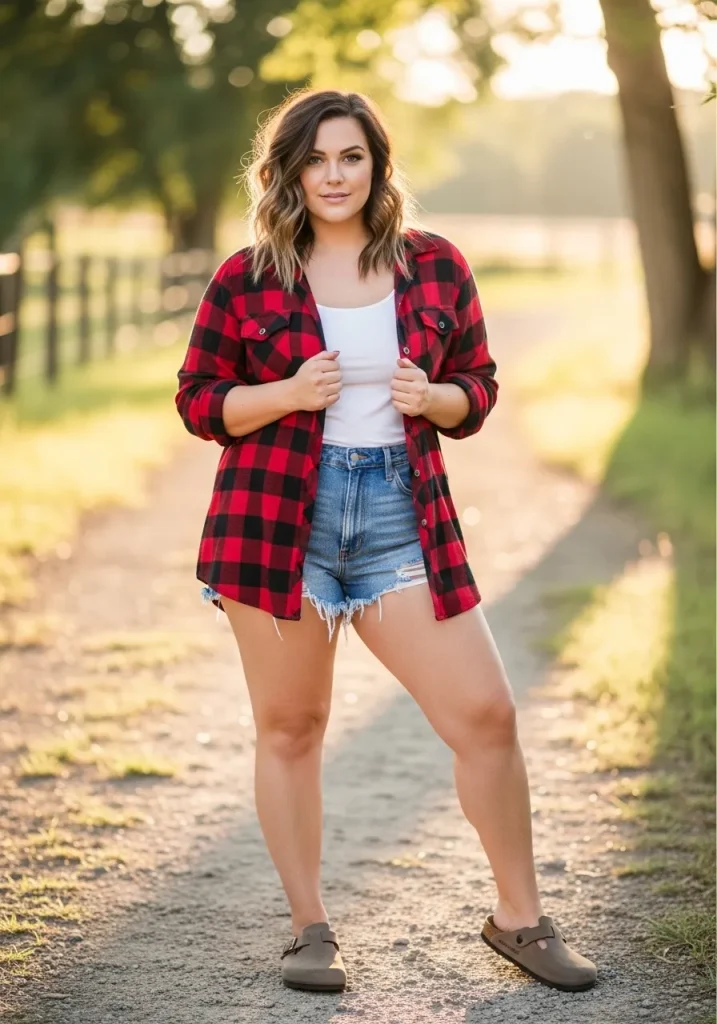 You can wear the flannel open over a tank or tied at the waist for variation. This outfit works well for casual outdoor days or laid-back weekend plans.