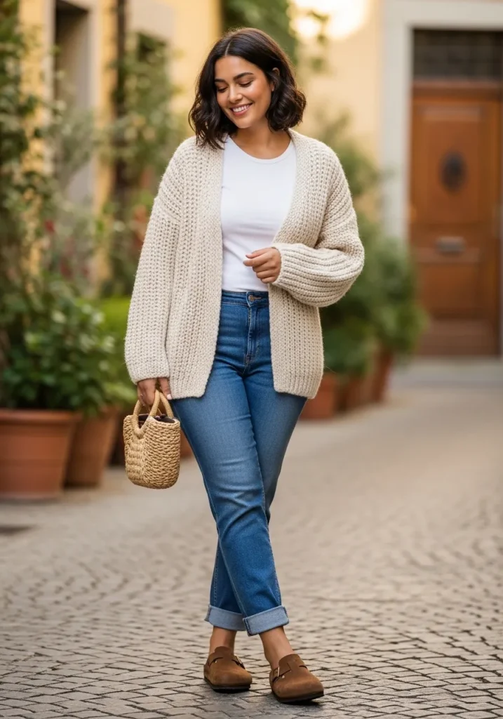 A cardigan paired with jeans and Birkenstock clogs creates a cozy and classic outfit that feels timeless. The cardigan adds softness while the jeans keep the look structured and balanced.