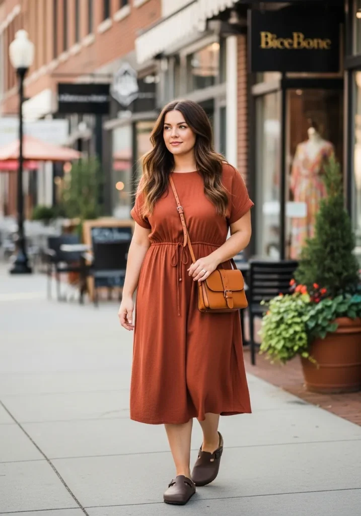A midi dress paired with Birkenstock clogs creates a soft and feminine outfit that still feels relaxed and wearable. The flowy dress adds movement and elegance while the clogs keep the look grounded and comfortable.