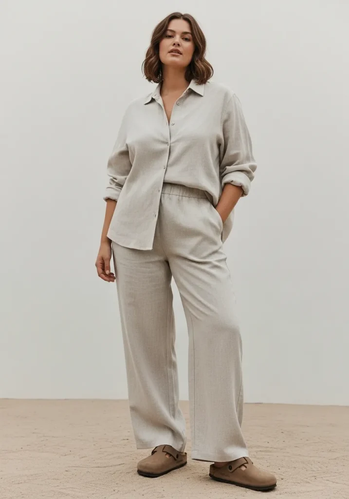 A linen set paired with Birkenstock clogs creates a clean and minimal outfit that feels perfect for warm weather. The breathable fabric keeps the look light and airy while the clogs add a relaxed touch.