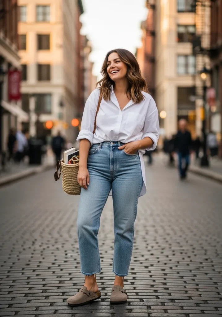 A button-up shirt styled with jeans and Birkenstock clogs creates a polished yet relaxed outfit. The structured shirt adds sophistication while the clogs keep the look comfortable.