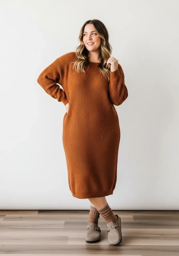 A knit dress paired with Birkenstock clogs creates a cozy and stylish outfit that feels perfect for cooler days. The soft knit texture adds warmth while the clogs keep the look relaxed.