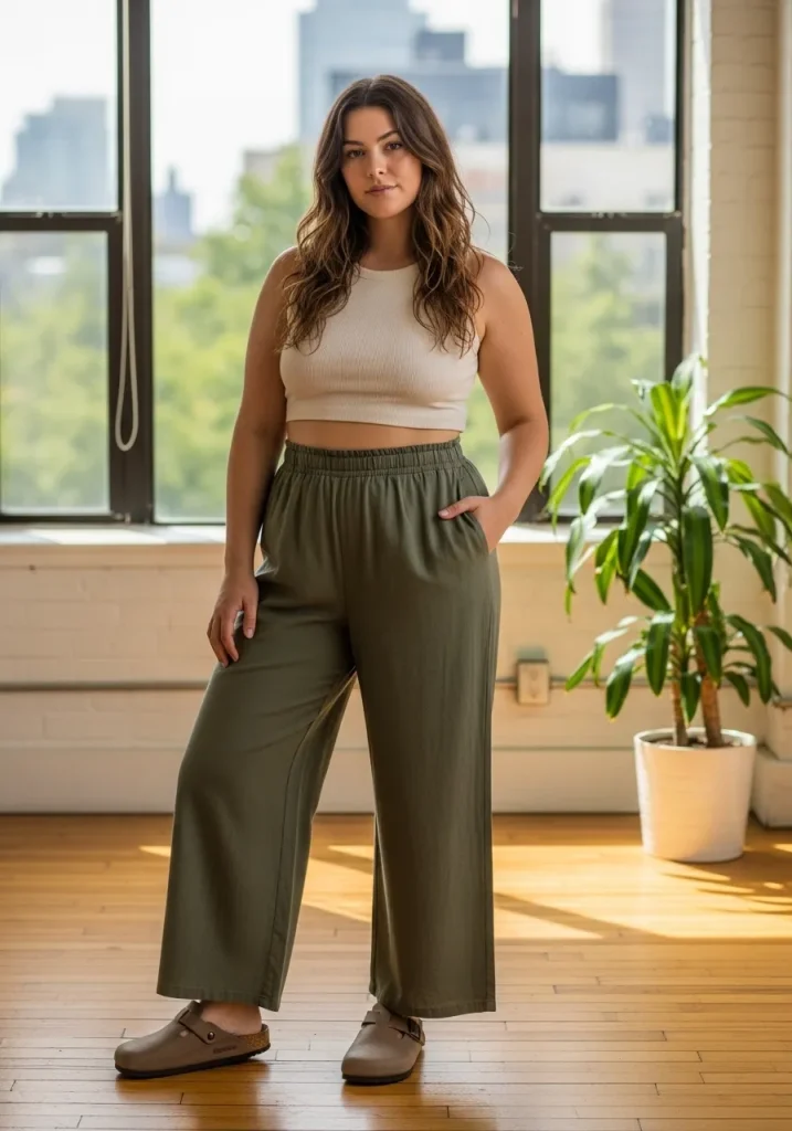 Neutral tones like white, beige, or olive enhance the aesthetic. Add simple jewelry and a woven bag for a complete look. This outfit is perfect for travel, brunch, or casual days.