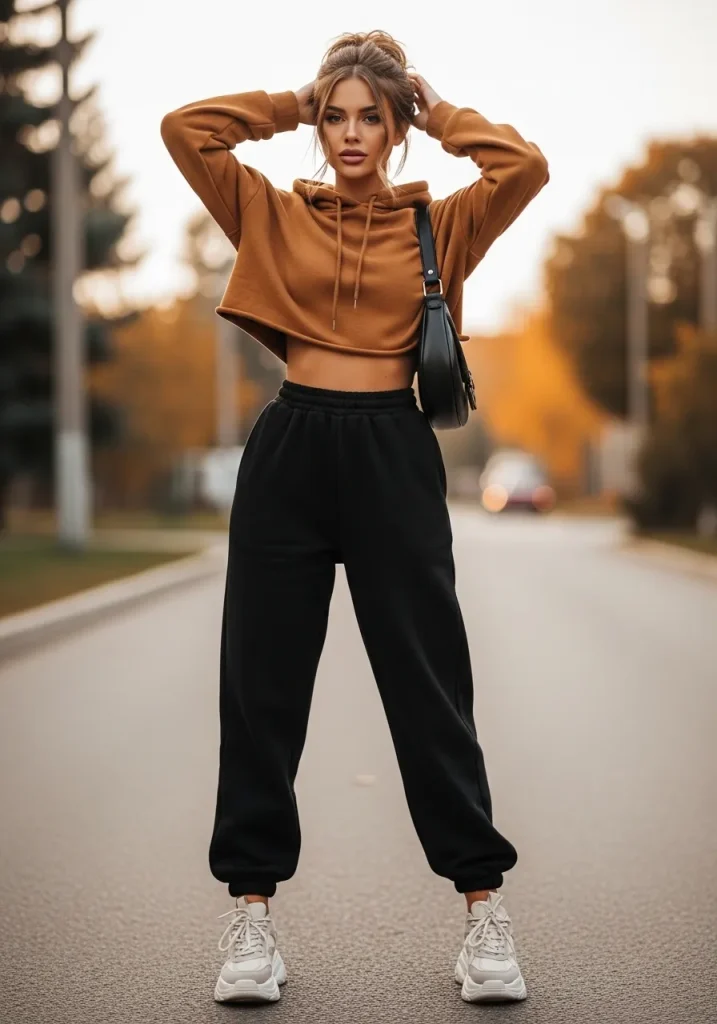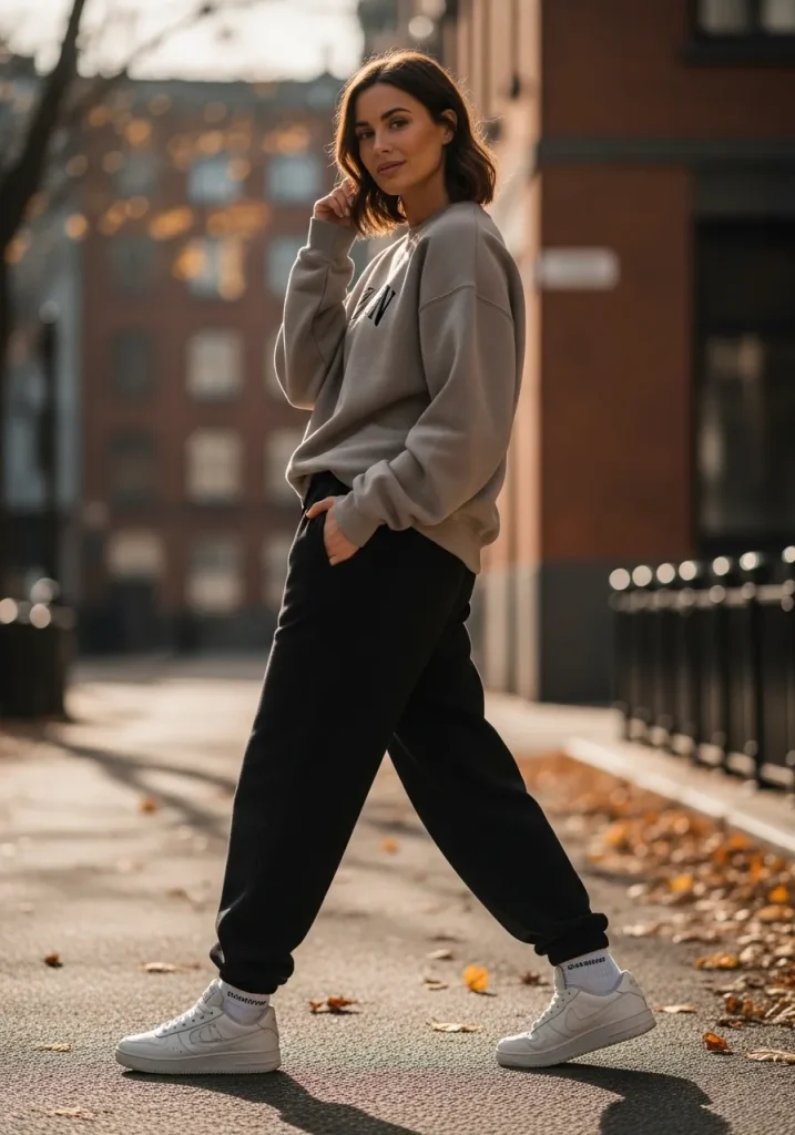 To keep the look polished, focus on proportions and details. Clean sneakers, a slick bun, and a structured tote instantly elevate this from loungewear to good outfits with sweatpants. It’s perfect for what to wear to school simple days, casual errands, or laid-back fall mornings when comfort is non-negotiable.