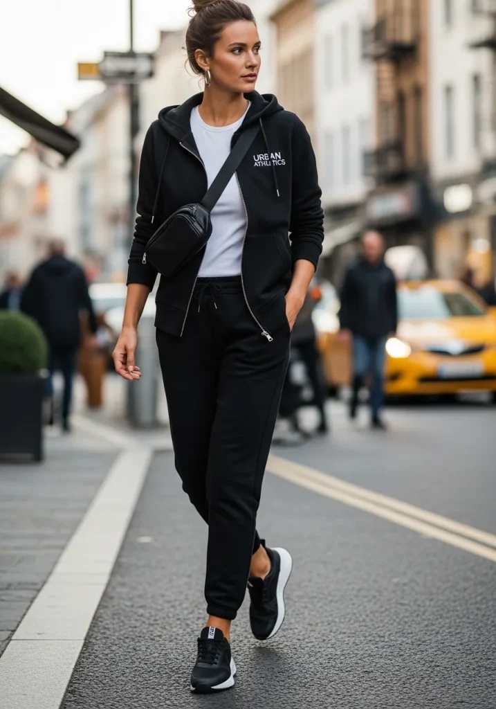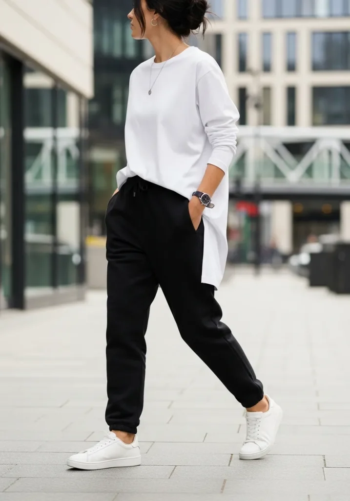 This is a go-to for errands, casual days, or black athleisure sweatpants for leisure moments when comfort is key. Neutral sneakers and minimal accessories help maintain a polished feel while staying true to everyday street style.
