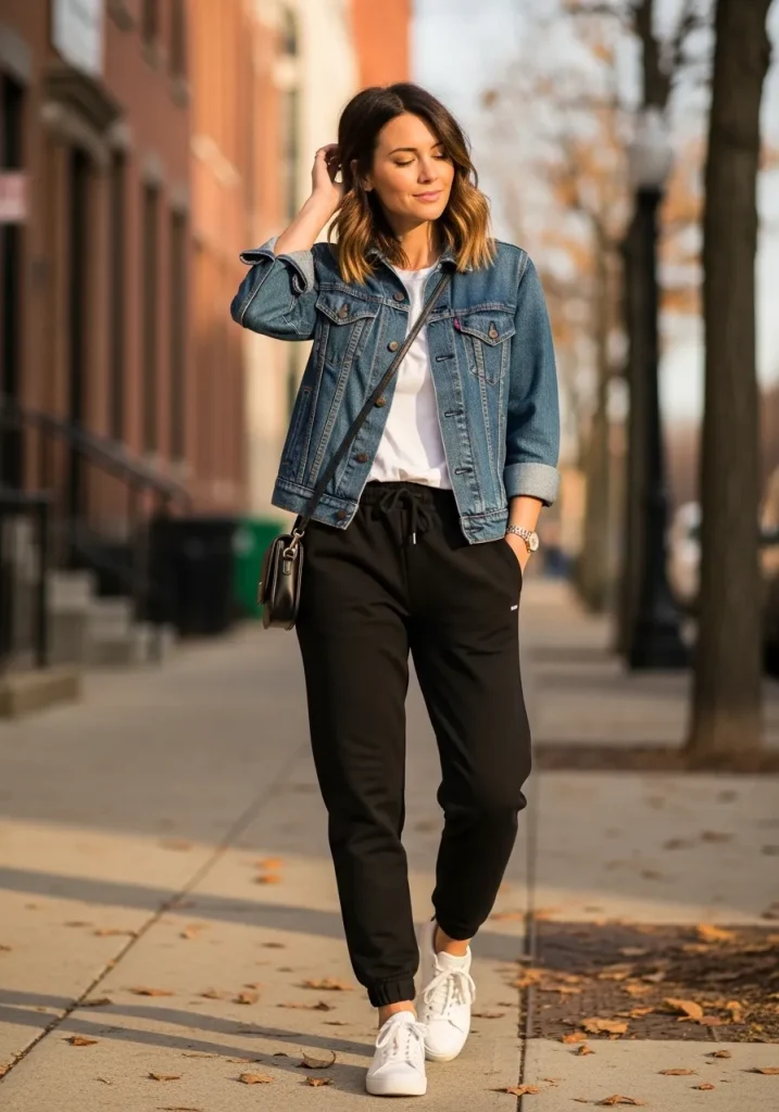 Denim jackets are a timeless layering piece that work beautifully with stylish black sweatpants. The structured denim contrasts perfectly with relaxed sweats, creating a look that feels casual yet styled. This outfit is especially great for fall sweatpants outfit days when temperatures fluctuate.