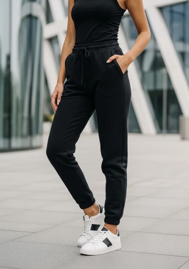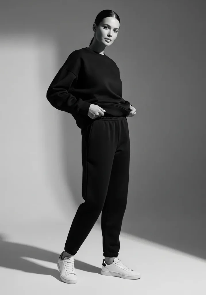 Classic but never boring, this look defines black athleisure sweatpants for leisure. A well-fitted hoodie paired with black sweats creates an easy everyday uniform that works for workouts, travel, or black sweatpants for loungewear during sports season.