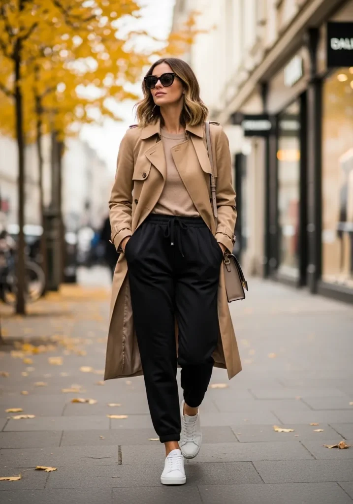 Pairing black sweatpants with a trench coat instantly makes the outfit feel elevated. The structured outer layer contrasts beautifully with relaxed bottoms, turning black sweatpants outfit into a polished black pants outfit fall look. This combo works especially well when the sweats are slightly tapered or sit clean at the ankle.