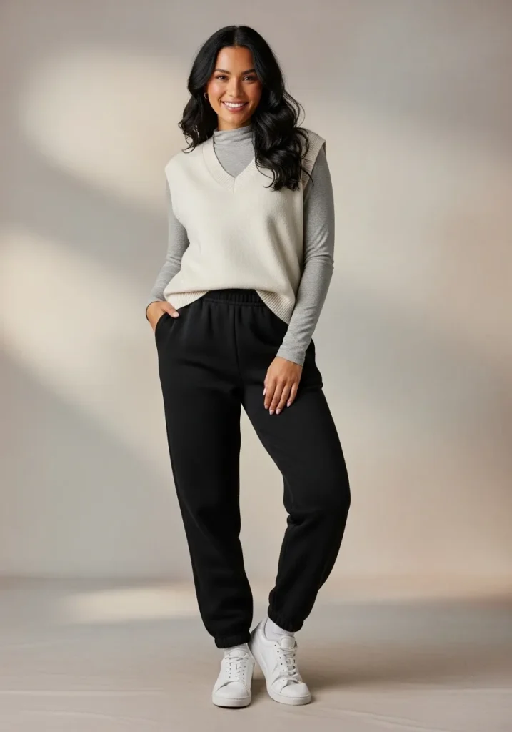 Sweater vests are an underrated styling piece when it comes to styling black sweatpants outfits. Layer one over a fitted long-sleeve tee or button-down to add structure and dimension. This look balances comfort with a slightly preppy vibe.