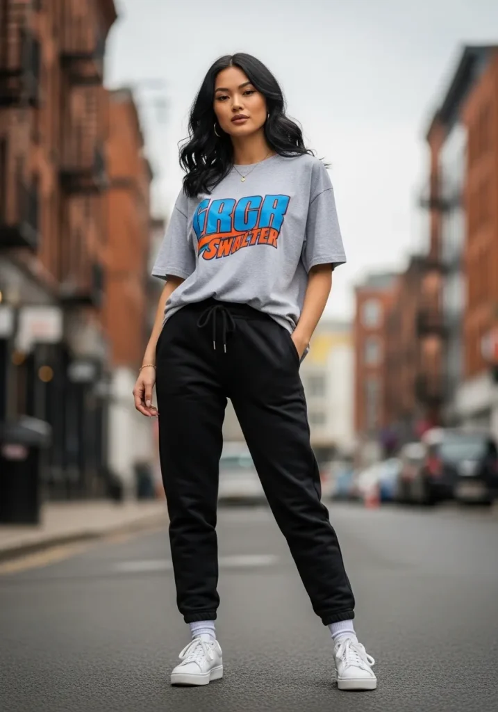 Graphic tees add personality to cute black sweatpants outfit ideas without overdoing it. Choose a slightly oversized tee to lean into the relaxed vibe, especially if you’re styling baggy clothes sweatpants. This creates a laid-back but stylish everyday look.