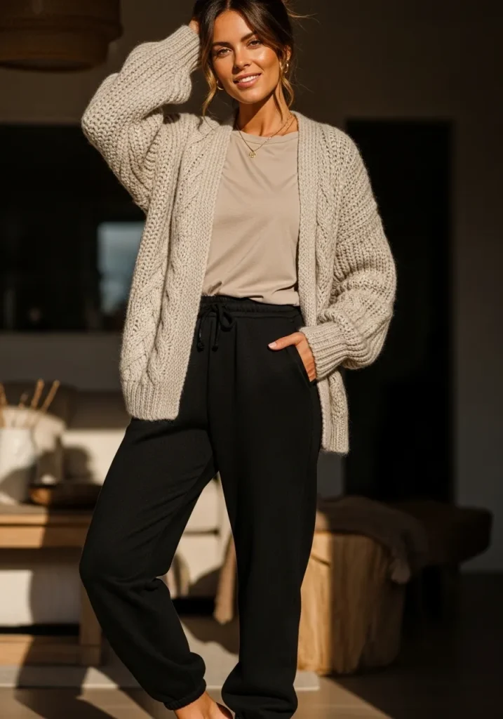 A knit cardigan softens the look of black sweats outfit and adds cozy fall texture. Worn open over a fitted top, it creates a layered look that feels warm yet styled. This is a great way to elevate black sweatpants for loungewear during sports season.