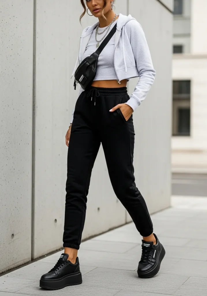 Shoes can completely change a black sweatpants outfit, and platform sneakers are proof. They add height and structure, making even baggy clothes outfit sweatpants feel more intentional and styled.
