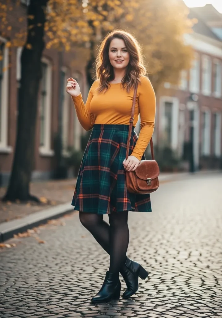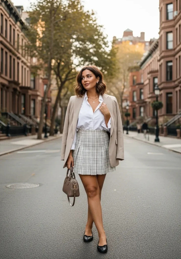Plaid skirts are a signature preppy staple that instantly channel Blair Waldorf vibes. Paired with tights and a fitted top, this outfit feels youthful, classic, and perfect for fall or winter.