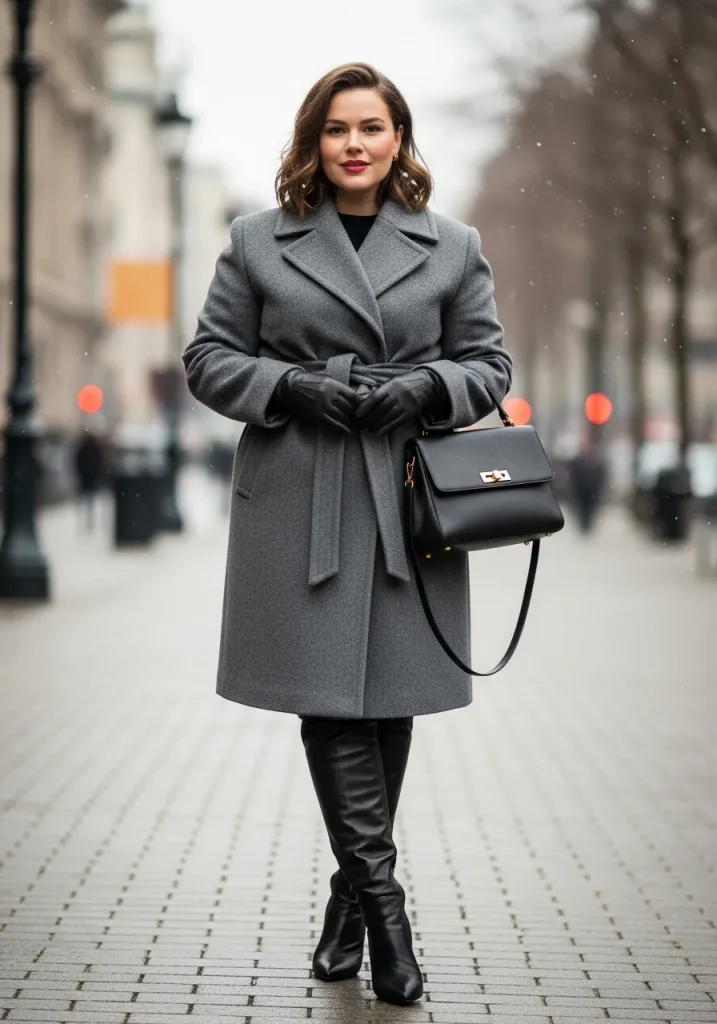 Choose a tailored wool coat in neutral tones like camel, cream, or black, and pair it with leather or knit gloves for added sophistication. Finish the look with heeled boots and a structured handbag. This outfit is perfect for colder days when you still want to look put together and refined.
