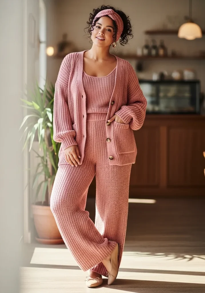 Choose a coordinated knit top and skirt set in neutral or pastel tones. Add a headband, tights if needed, and classic flats or boots. This look is comfortable yet polished, making it perfect for casual days with a chic twist.