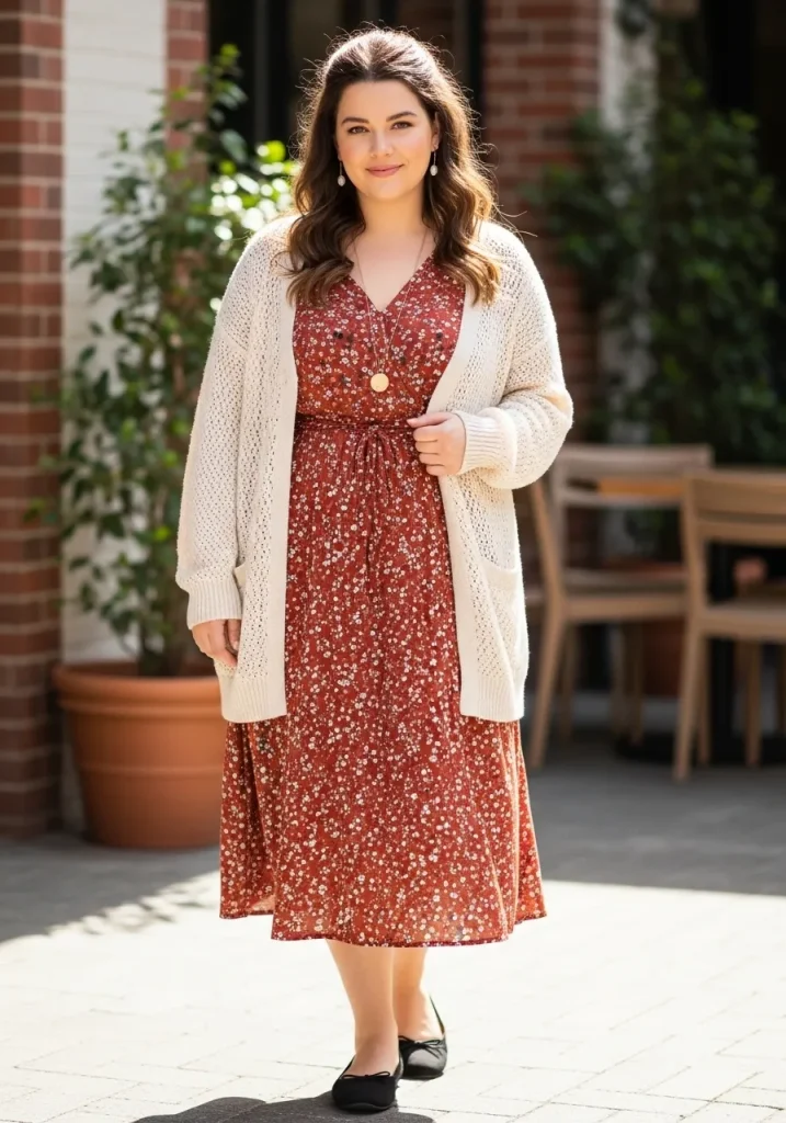 Layering a cardigan over a midi dress creates a soft, romantic outfit that feels both comfortable and elegant. It’s a simple combination that can easily be styled up or down depending on the occasion.