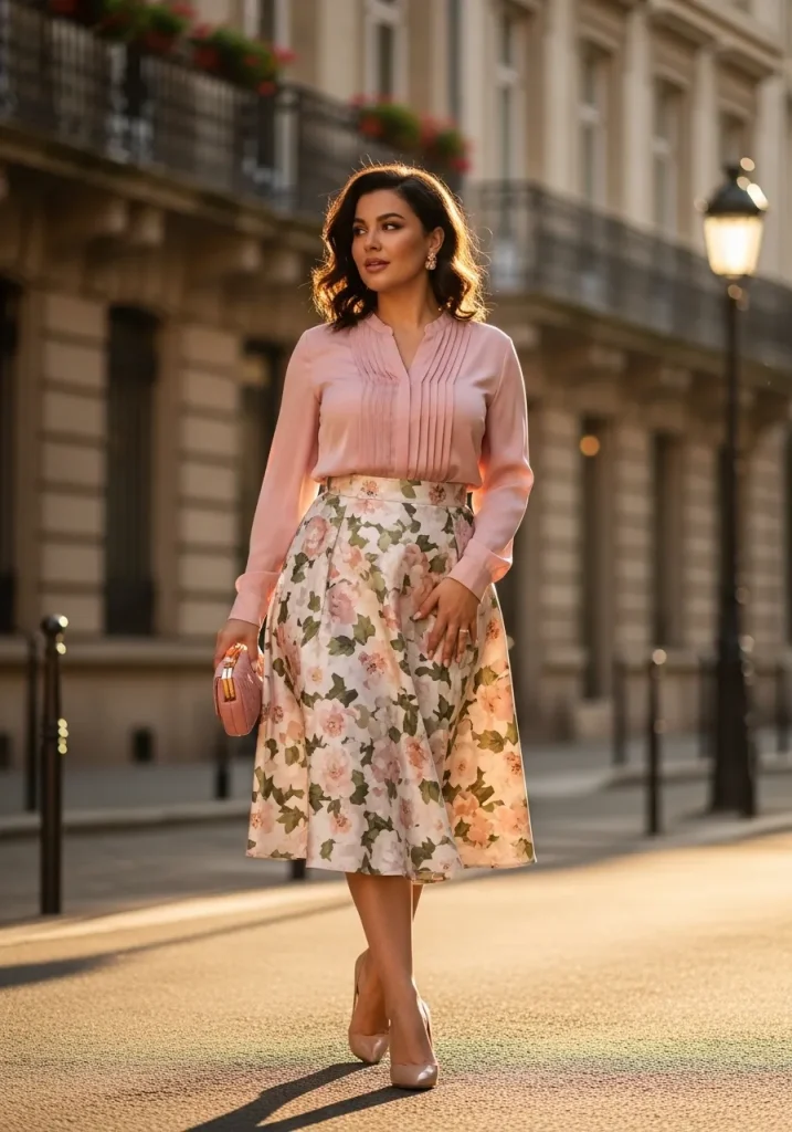 A silky blouse tucked into a high-waisted skirt creates a refined, feminine silhouette that flatters every body shape. This look is perfect if you want something elegant yet easy to wear, making it a go-to for brunch dates or even office days.
