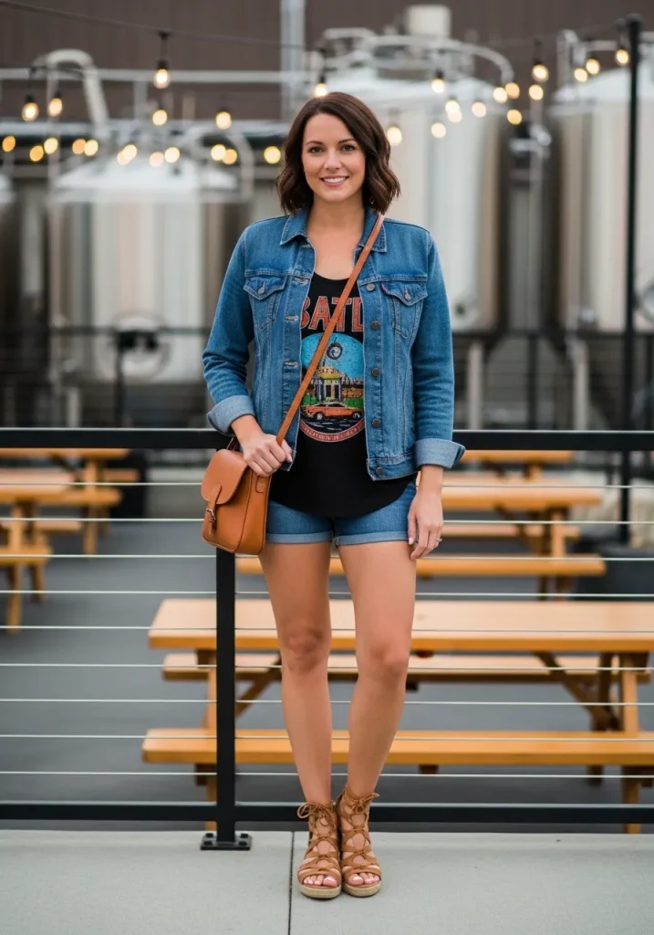 For footwear, tan strappy wedges are a perfect choice, offering a blend of comfort and style. The wedges give a little height but remain easy to walk in, whether you’re wandering the brewery or chatting with friends. You can also switch it up with sandals or even white platform sneakers for an extra casual vibe, perfect for a warm summer day. The combination of denim and graphic tees will always keep you looking effortlessly chic, and it’s simple enough to transition from a brewery tour to a casual evening out.