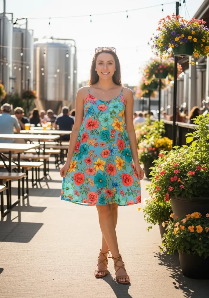 When styling this outfit, choose comfortable footwear like tan strappy wedges or sandals. The soft, neutral tones of tan will complement the vibrant floral print of the sundress, adding to the chic, effortless vibe. This outfit strikes the right balance of casual and cute, making it perfect for any brewery, especially in the spring or summer when the weather is warm. You’ll feel both confident and relaxed as you indulge in beer tasting while embracing the sunshine.