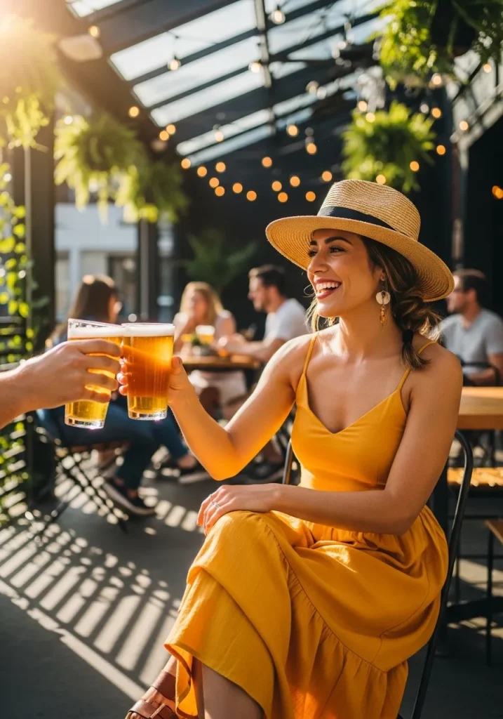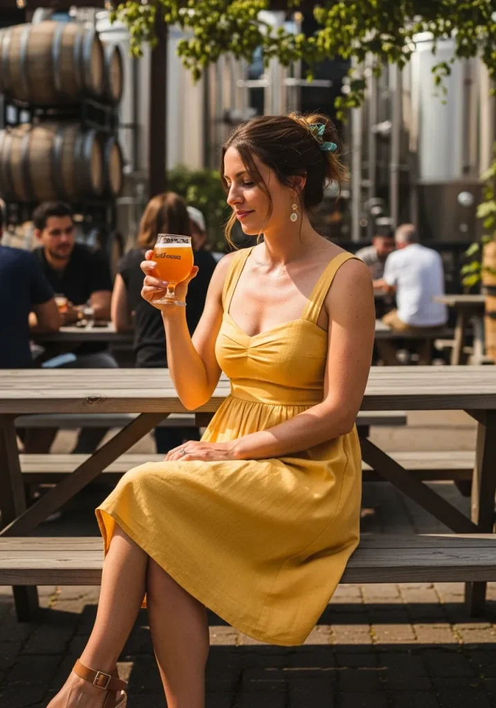 Complete the look with simple accessories, like a straw hat or minimalist jewelry, to keep the focus on the sundress. Brown leather sandals or wedges work beautifully with the dress, offering both style and practicality. A yellow sundress captures the essence of casual summer beer tasting, ensuring that you look cute and effortlessly chic throughout the day. It’s a perfect example of what to wear to a pub or brewery in the warmer months.