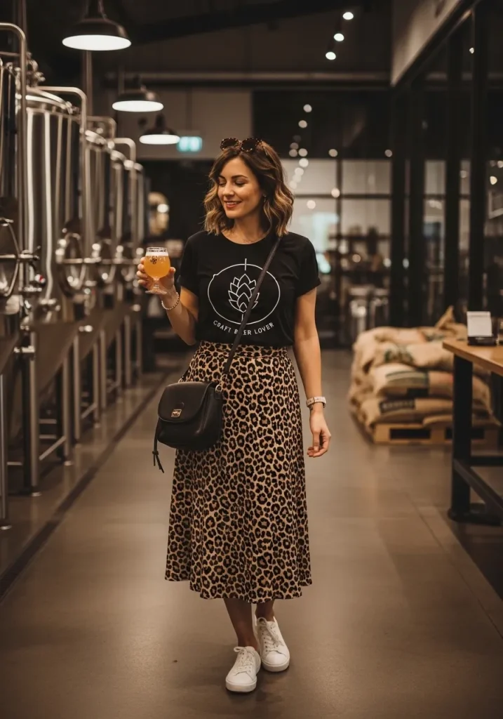Add a bit of flair to your brewery tour outfit with a leopard print skirt. The bold pattern brings a fun twist to any casual look, making it perfect for a laid-back yet stylish beer tasting experience. Pair it with a simple graphic tee to keep the focus on the skirt’s striking pattern while ensuring the look remains relaxed. The combination of a printed skirt and a basic tee creates a trendy yet casual outfit that’s perfect for a brewery setting.