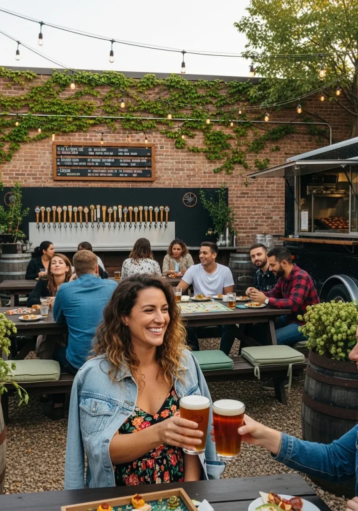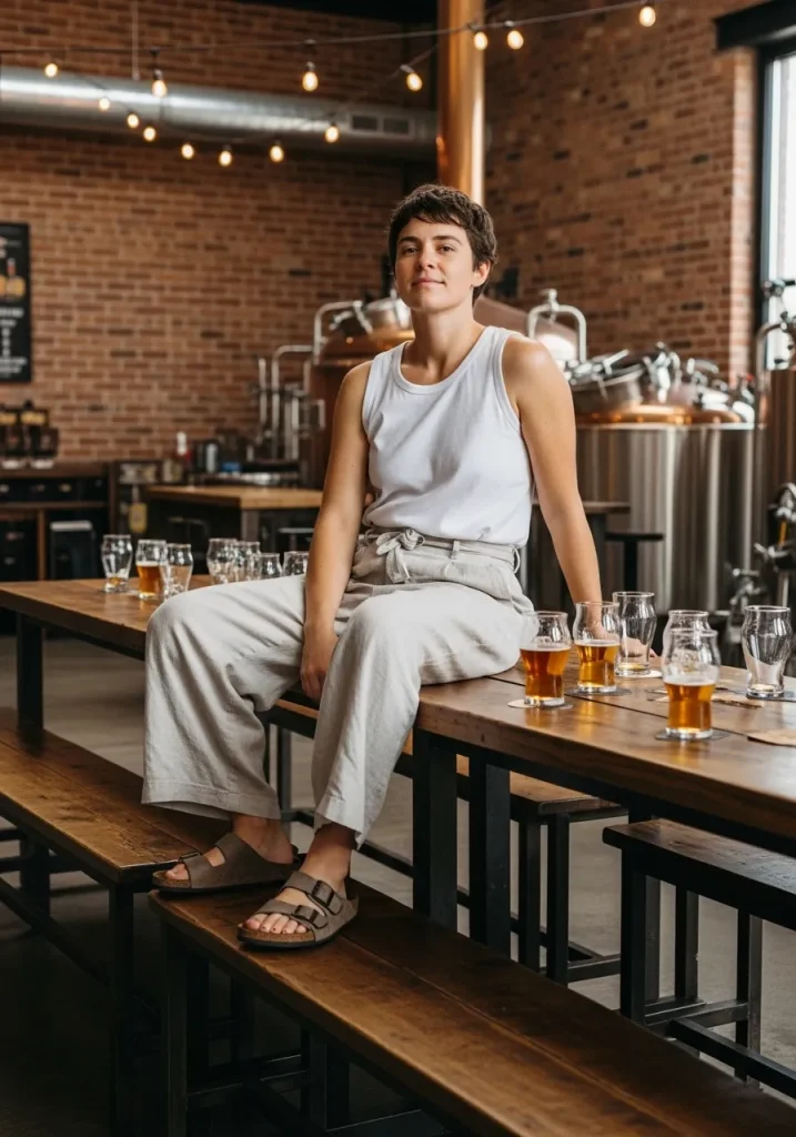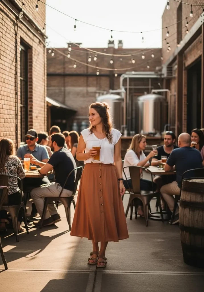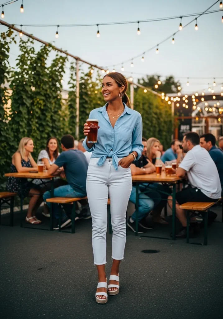 For shoes, white platform sandals are a fantastic option, adding a little height without compromising comfort. The button-front skirt is perfect for warm weather and provides that effortless chic vibe that’s perfect for sipping beer in the sun. This look is easy to assemble from your casual wardrobe, giving you a chic and comfy ensemble that fits perfectly into any brewery or pub setting.