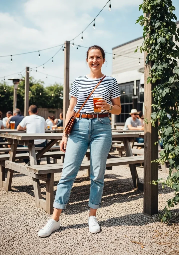 To complement the stripes, pair this with comfortable sneakers or casual sandals. White sneakers work particularly well, as they add a crisp and clean element to the outfit. The light-wash jeans give off an effortlessly chic vibe, perfect for warm weather and outdoor brewery settings. Whether you’re relaxing in the beer garden or strolling through the brewery’s grounds, this outfit ensures comfort while maintaining a chic, casual edge.
