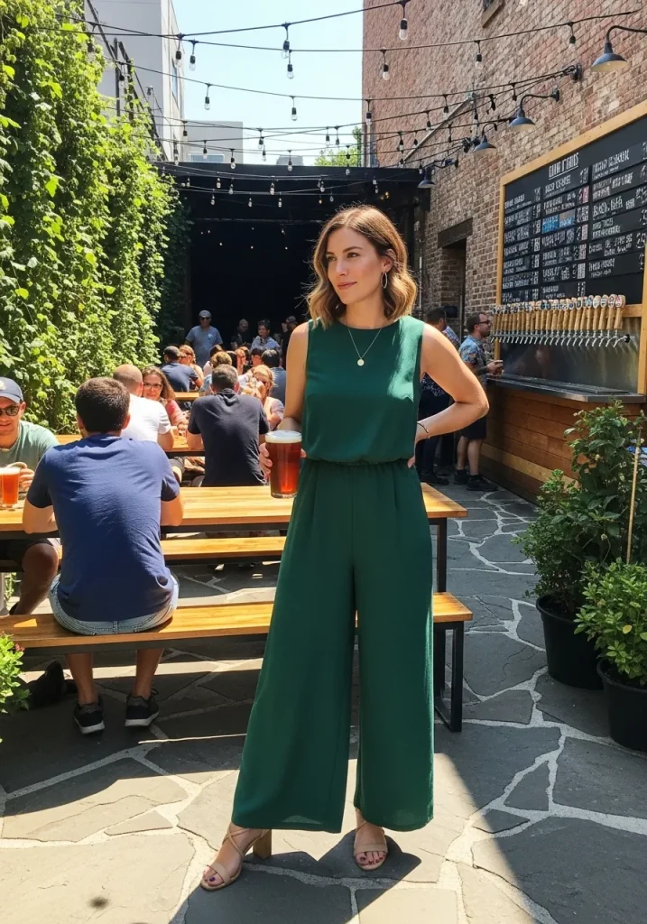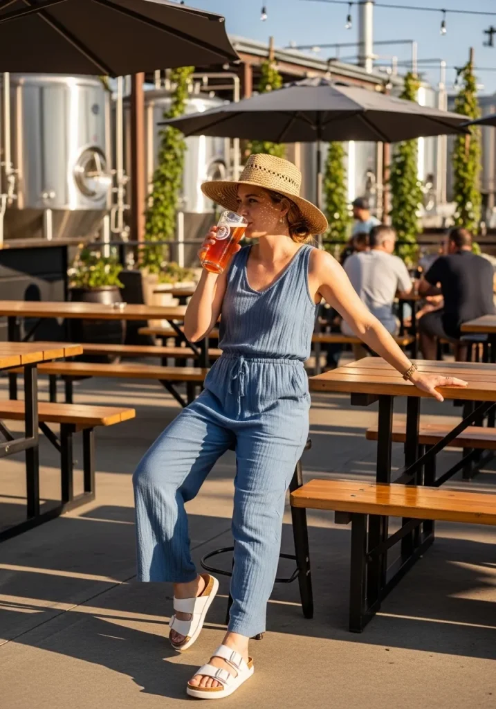 Pair the jumpsuit with neutral tan strappy sandals or wedges to keep the look casual yet chic. The sleeveless jumpsuit gives off an effortless vibe, making it perfect for enjoying a casual day at the brewery or pub. Add a stylish hat or a simple bag, and you’re all set for a comfortable, fashionable brewery tour or beer tasting. This look is all about effortless chic style, combining both relaxed fit and elegant outfit inspirations.