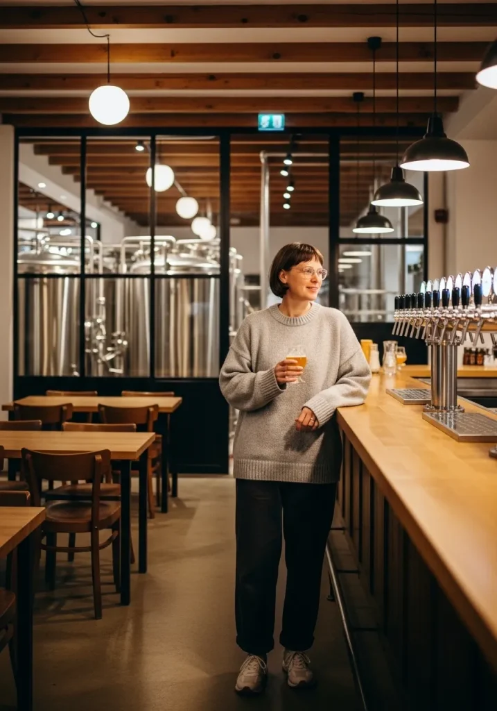 For cooler brewery days, a cozy sweater paired with relaxed trousers is an excellent way to stay comfortable while looking chic. This outfit is perfect for brewery tours in the fall or early spring when the weather is still a bit chilly. A soft, oversized sweater in a neutral color like light gray or beige gives a relaxed vibe, while the trousers provide both comfort and sophistication. It’s a versatile outfit that can be worn at both a brewery and a casual pub setting.