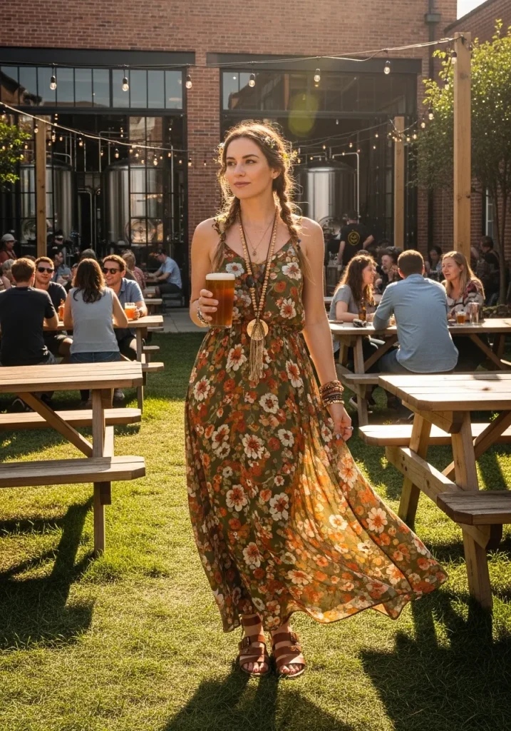 A maxi dress with a boho-chic vibe is perfect for a brewery tour that feels more like a festival day. The flowy design and floral print make it an ideal outfit for a casual yet stylish outing. If you’re planning on visiting a brewery with an outdoor festival atmosphere or even attending a beer tasting event, a floral maxi dress will have you feeling stylish and comfortable all day long. This outfit gives off a relaxed yet refined vibe, making it a great choice for enjoying craft beer in the sunshine.