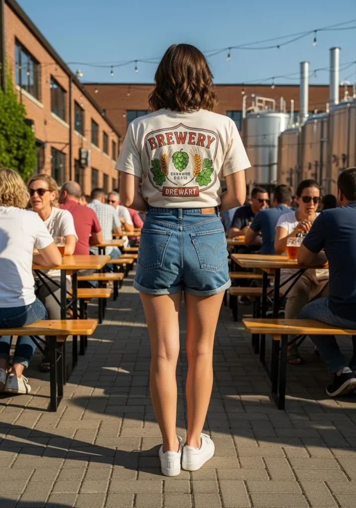 For a casual summer beer tasting, a graphic tee paired with high-waisted shorts is both stylish and practical. The high-waisted shorts elongate your legs while providing a comfortable fit for brewery tours, allowing you to move freely as you sample different beers. A graphic tee adds personality and charm to the outfit, whether you’re supporting your favorite band or showcasing quirky slogans. This is an outfit that effortlessly embraces that relaxed yet chic vibe, perfect for warm days spent at a brewery.